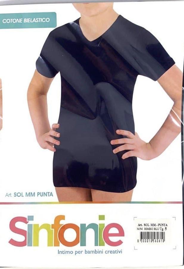 Maglia intima bianca in cotone bielastico. Modello per bambino con scollo a V a punta e mezze maniche. Presente modelli a tinta unita di colore nero, blu navy e avion