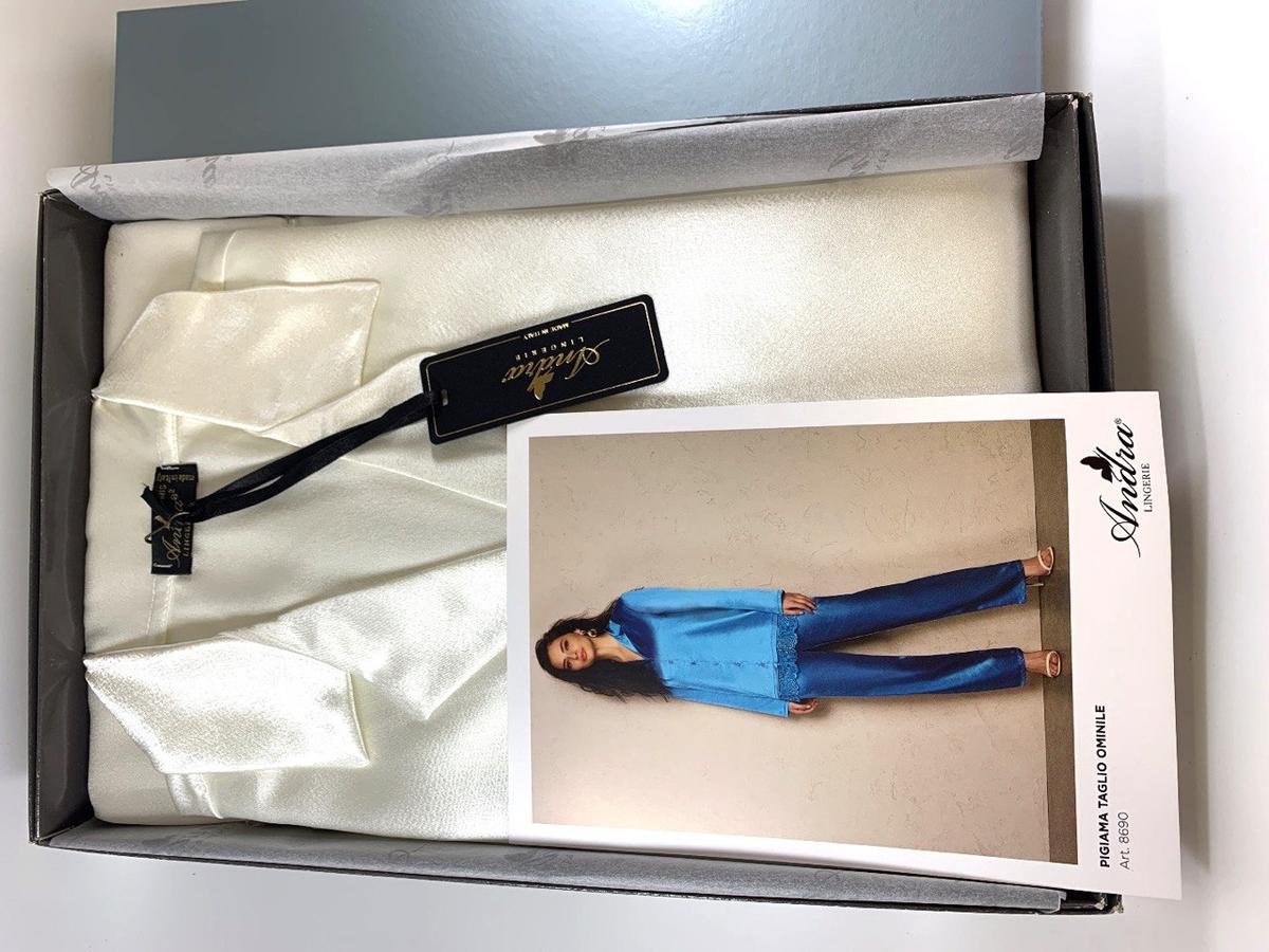 Elegante pigiama con design satinato color seta. Modello con taglio uomo, con bottoni e orlo rifinito in pizzo tono su tono. Sensuale e chic.