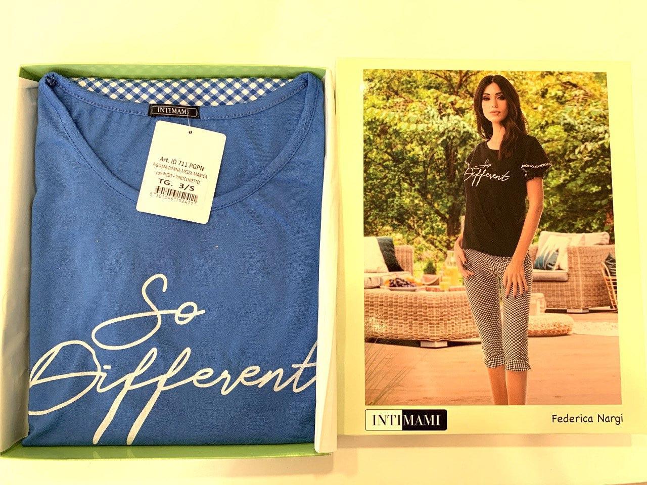 Pigiama con stampa stilizzata “So Different” che valorizza il design a tinta unita del pezzo superiore. Il pantalone u00e8 a tre quarti con orlo arricciato e pattern geometrico all over. Ideale per i mezzi tempi, u00e8 disponibile nei colori nero e indaco.