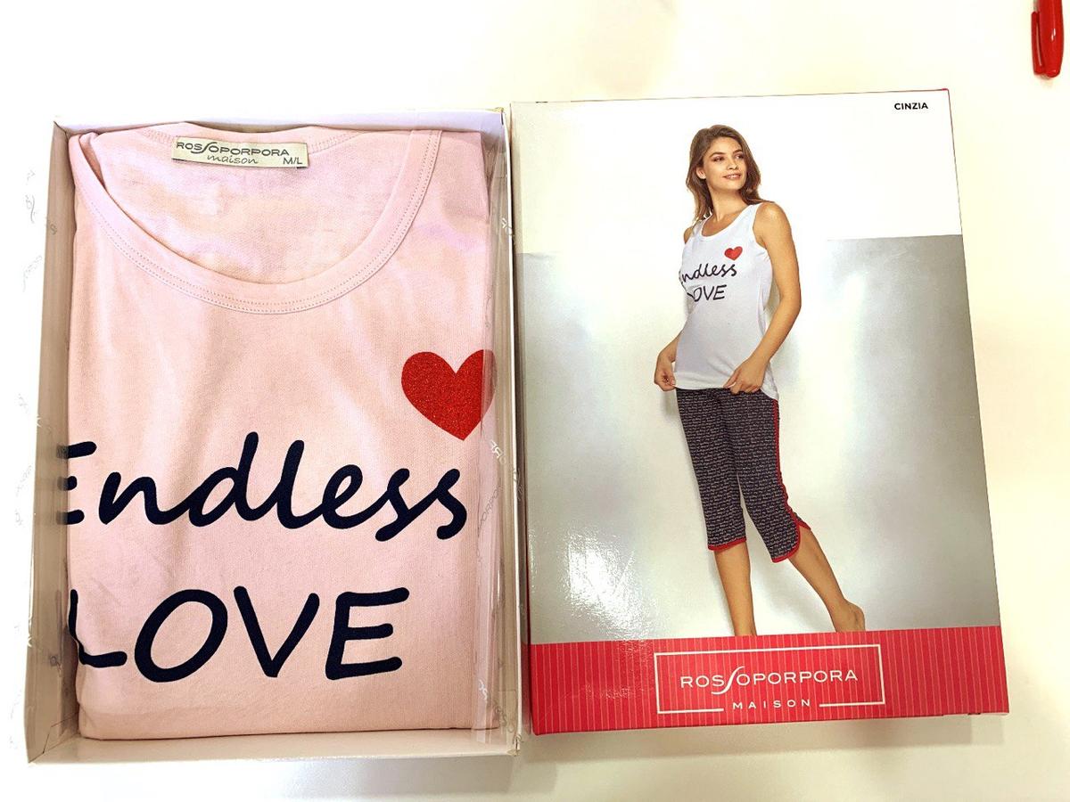 Pigiama smanicato con maglia a girocollo. Presenta stampa “Endless Love” in corsivo accompagnato dal cuoricino mentre il pantaloncino u00e8 a tre quarti a tinta unita piu00f9 scura. Disponibile nei colori bianco e rosa cipria.
