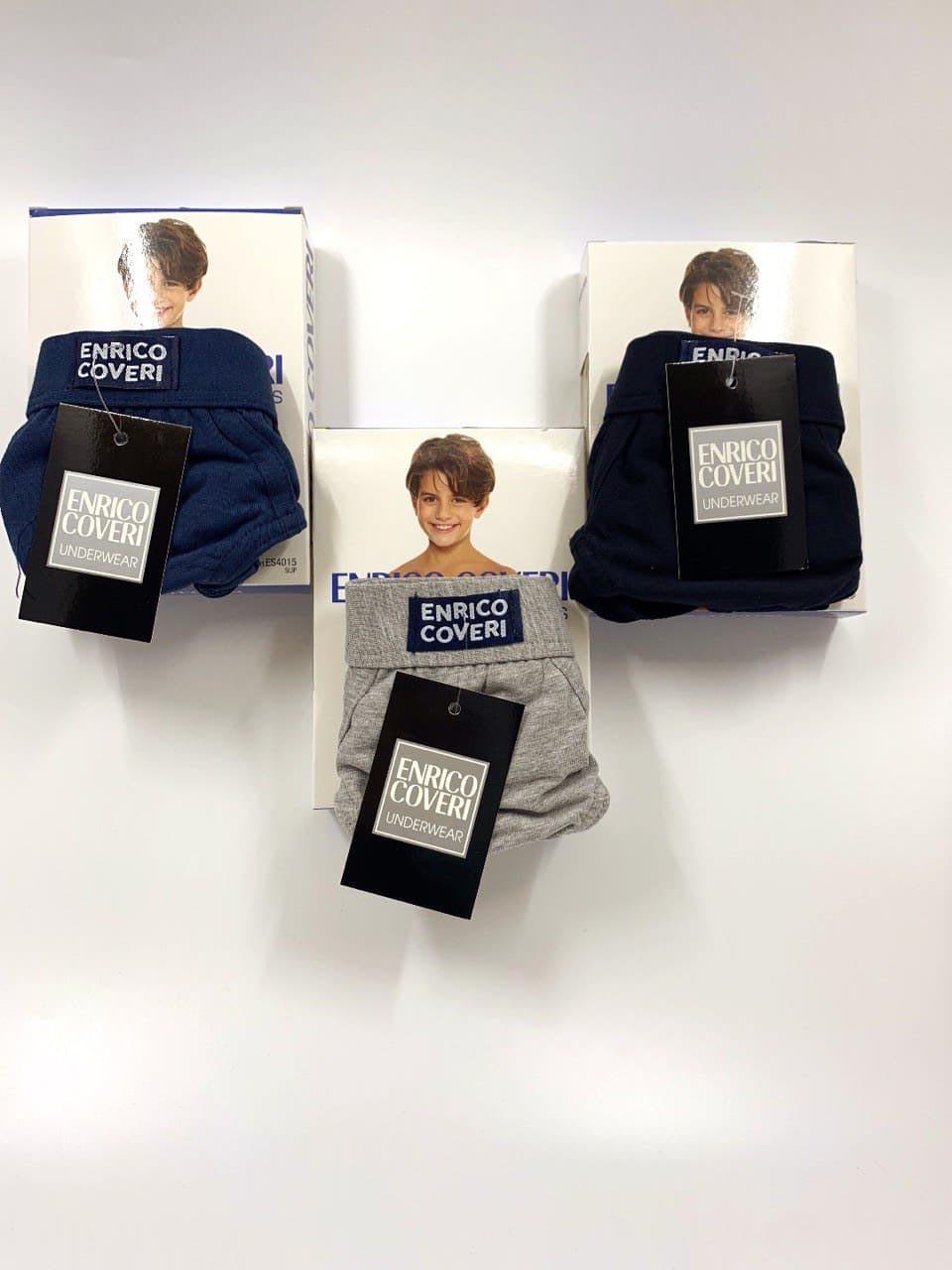 Slip di cotone con elastico interno. Modello con etichetta Enrico Coveri a vista. Presenta le nuances a tinta unita assortite di colore jeans, grigio chiaro e blu notte. Ideale per bambini e ragazzi di etu00e0 compresa tra i 3 e i 16 anni.
